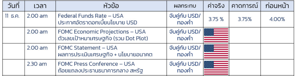 - 11 ธ.ค. FOMC ของ ธนาคารกลางสหรัฐฯ (Fed) ลงมติ ลดอัตราดอกเบี้ยนโยบายลง 0.25% คืนที่ผ่านมา หลังการลดแล้ว อัตราดอกเบี้ยนโยบายจะอยู่ในช่วง 3.50%–3.75% นี่ถือเป็น การลดอัตราดอกเบี้ยครั้งที่ 3 ติดต่อกันในปีนี้ (ทุกครั้งลดลง 0.25%)