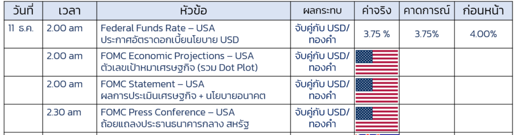- 11 ธ.ค. FOMC ของ ธนาคารกลางสหรัฐฯ (Fed) ลงมติ ลดอัตราดอกเบี้ยนโยบายลง 0.25% คืนที่ผ่านมา หลังการลดแล้ว อัตราดอกเบี้ยนโยบายจะอยู่ในช่วง 3.50%–3.75% นี่ถือเป็น การลดอัตราดอกเบี้ยครั้งที่ 3 ติดต่อกันในปีนี้ (ทุกครั้งลดลง 0.25%)
